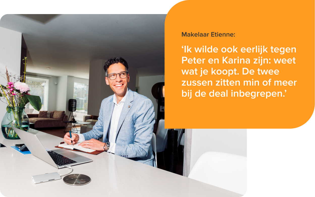 Etienne: ‘Ik kijk altijd naar de gezichten van mijn klanten tijdens een bezichtiging. En die van Peter en Karina vertelden mij genoeg. Ik zag hoe gecharmeerd ze waren van de plek en het pand. Maar ik wilde ook eerlijk tegen ze zijn: weet wat je koopt! Namelijk een huis dat ‘gesandwicht’ zit tussen twee hele hechte familieleden. De twee zussen links en rechts zitten min of meer bij de deal inbegrepen. Daar moet je écht goed over nadenken.’