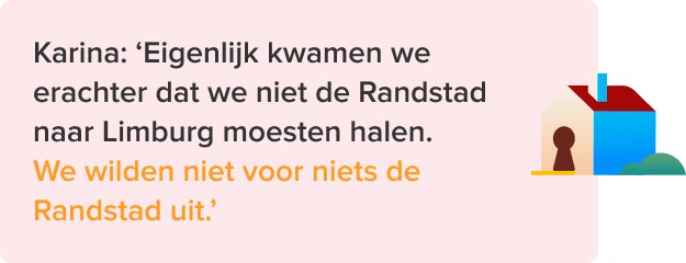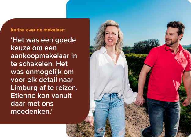 Karina: ‘Het was een goede keuze om een aankoopmakelaar in te schakelen. Wij zaten toch helemaal in Den Haag, zo’n 250 kilometer verderop. Het was onmogelijk om voor elk detail naar Limburg af te reizen. Etienne kon vanuit daar met ons meedenken.’